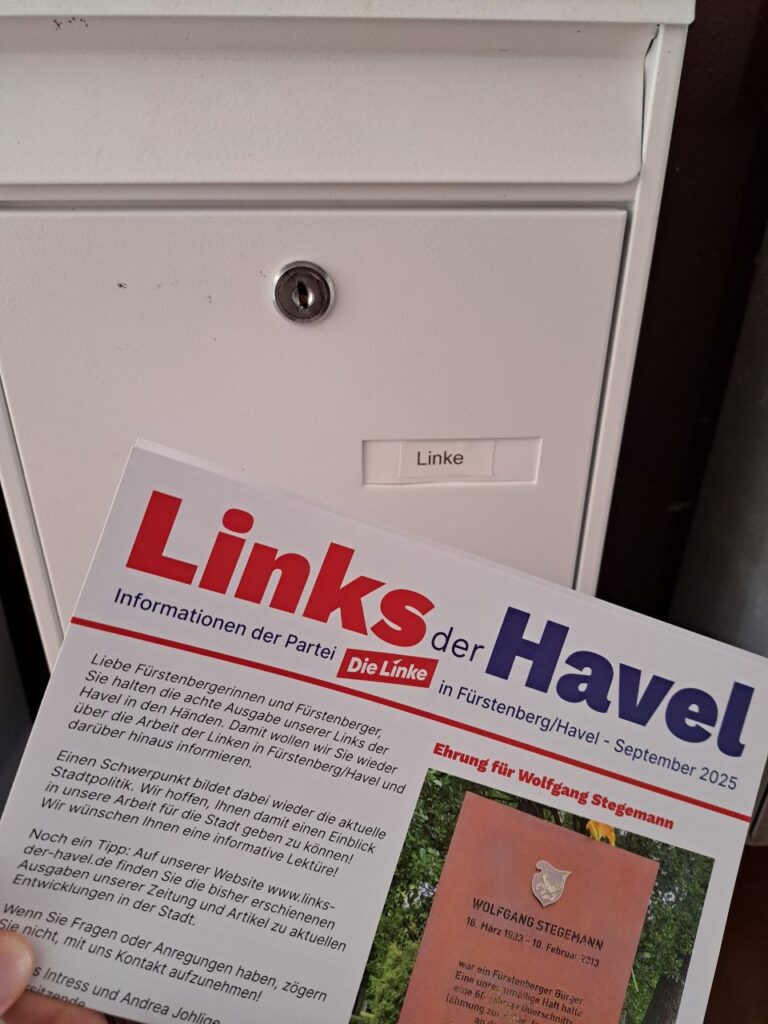 Am Samstag stand dann die Verteilung der mittlerweile 8. Ausgabe der Links der Havel auf dem Programm. Dazu hatten wir Fürstenberger Linke tatkräftige Hilfe aus der Basisorganisation Berlin Gesundbrunnen. Unter dem Motto „Flyern wo andere Urlaub machen“ waren wir mit knapp 20 Menschen unterwegs und haben die Links der Havel in die Briefkästen der Fürstenbergerinnen und Fürstenberger gebracht. Vielen Dank an alle, die mitgeholfen haben!